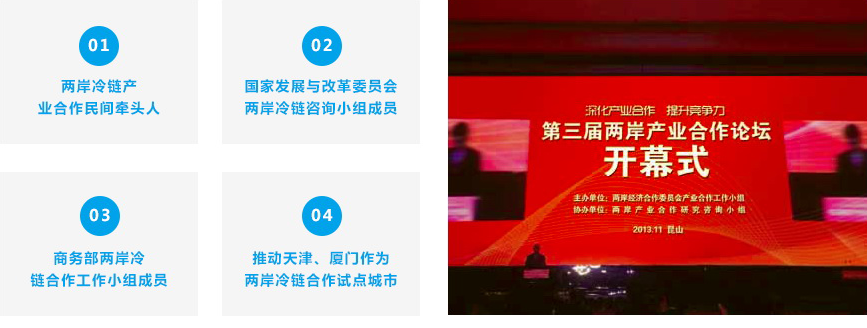 Mainland and Taiwan's cold chain logistics industry cooperation was led by the ministry of commerce. Our team has specifically promoted the work, led by Director Li Jinying. Now Tianjin and Xiamen has become the pilot cities of Mainland-China cooperation in the cold chain logistics industry. 29 cold chain logistics industry cooperation pilot projects have been signed. We actively develop new pilot city, innovate a new mechanism of "government, industry and research" to promote local logistics industry system construction.